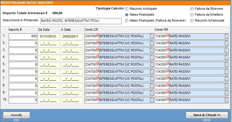 Si supponga di dover registrare l'incasso di interessi attivi relativi a titoli per un importo pari a 600 € per l'intervallo temporale 01/11/2010 - 28/02/2011.