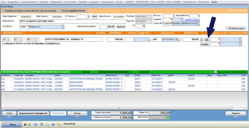 Per registrare il rateo passivo selezionare il pulsante “RR” in corrispondenza della linea del conto "Affitti attivi su immobili civili".
