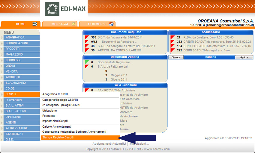 Edi-Max consente di effettuare la stampa del registro dei cespiti. Per effettuare tale operazione, dal menu principale selezionare “Cespiti” e “Stampa Registro Cespiti”.