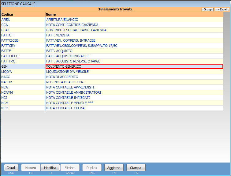Viene proposto l’elenco delle causali contabili: selezionare la causale relativa al movimento generico (MOVIMENTO GENERICO).