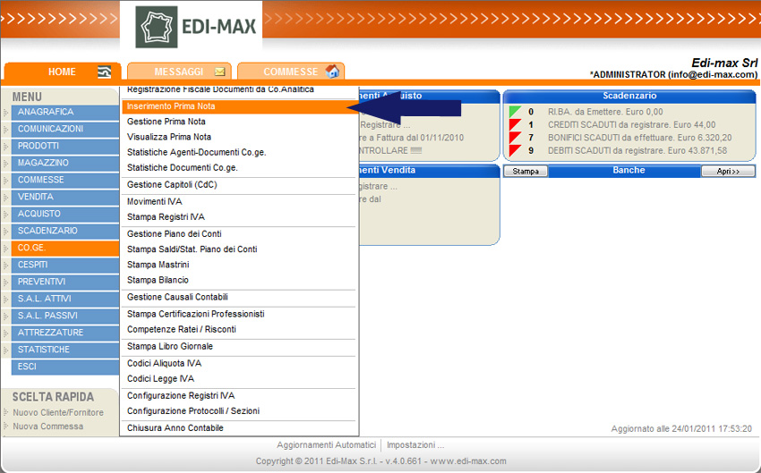 Per registrare il pagamento dell’assicurazione RCA con Edi-Max, aprire il menu “Co.Ge.” e selezionare la sezione “Inserimento Prima Nota”.