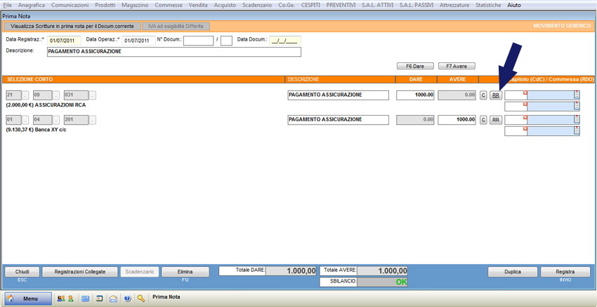 Si supponga di dover registrare il pagamento dell’assicurazione RCA per un importo pari a 1.000 €.