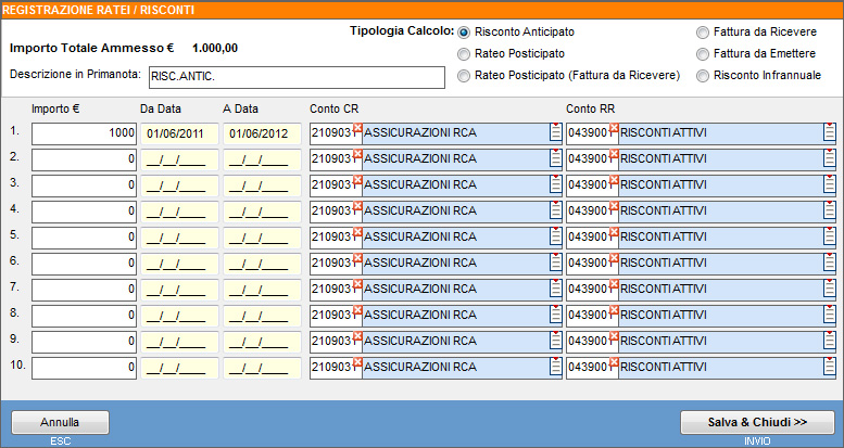 Per registrare il risconto attivo selezionare il pulsante “RR” in corrispondenza della linea del conto "Assicurazioni RCA".