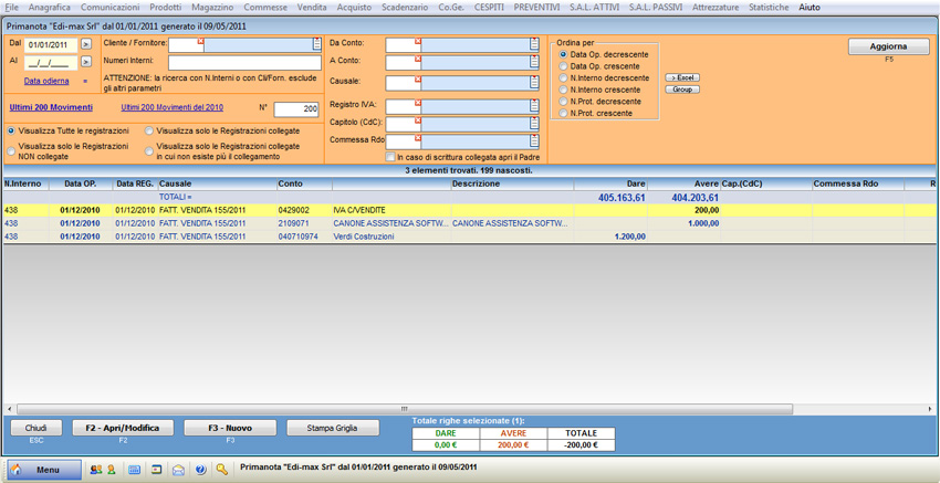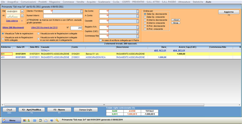 Sul libro giornale la rilevazione è la seguente: