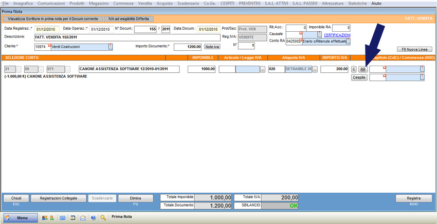 Si supponga di registrare una fattura di vendita del canone di assistenza software al cliente Verdi Costruzioni per un totale di 1.200 €. L’Iva relativa a tale importo ammonta a 200 €.