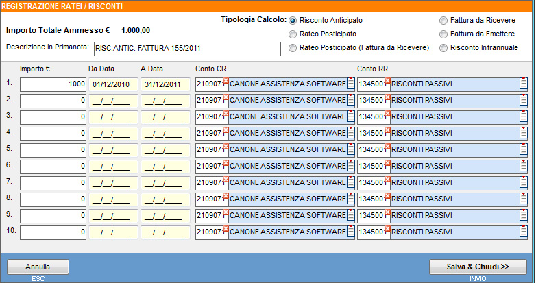 | 01/01/2011 | Canone assistenza software | Imputazione parte competenza 2011 | 500 |