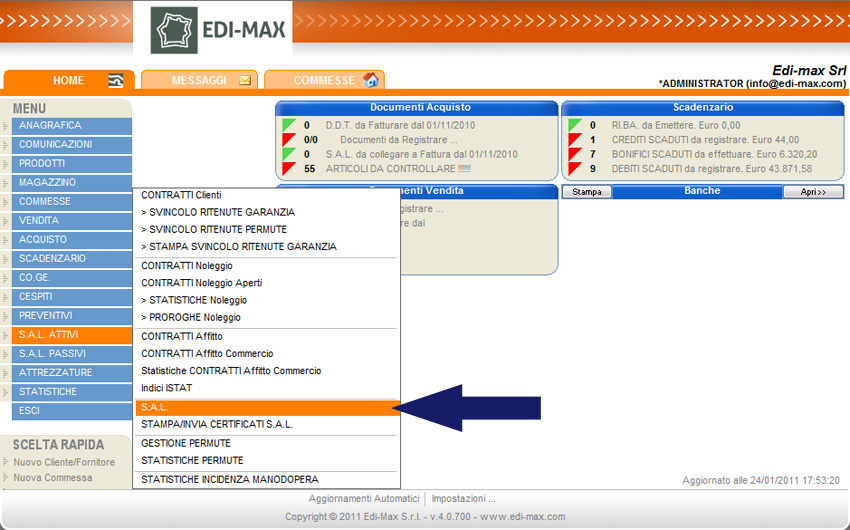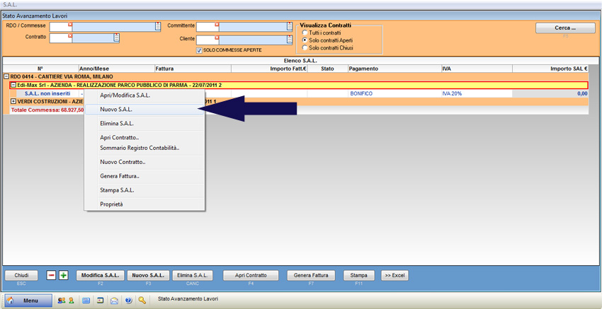 Per inserire un nuovo S.A.L., dal menu principale selezionare la voce “S.A.L. Attivi” e “S.A.L.”.