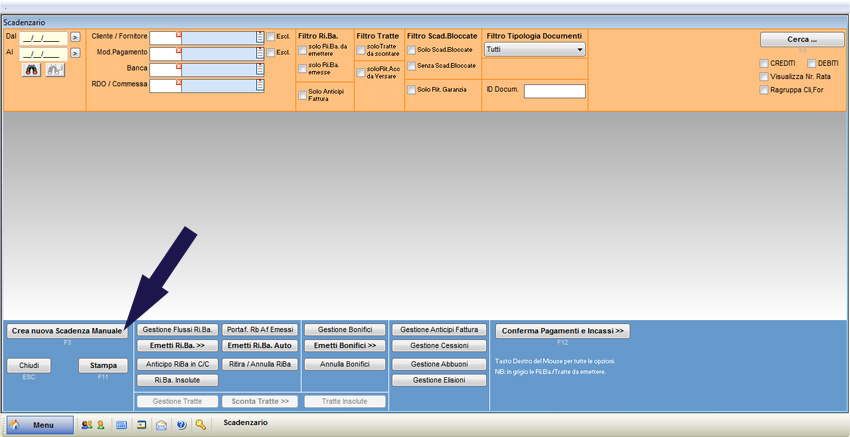 Per inserire una scadenza manuale, dal menu principale selezionare “Scadenzario” e “Scadenzario Pagamenti”. Dalla schermata di ricerca dello scadenzario selezionare il pulsante “Crea nuova Scadenza Manuale” nella parte inferiore della schermata.