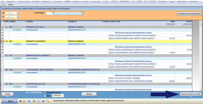 Dal menu principale selezionare “Cespiti” e “Generazione Automatica Scritture Ammortamenti”.