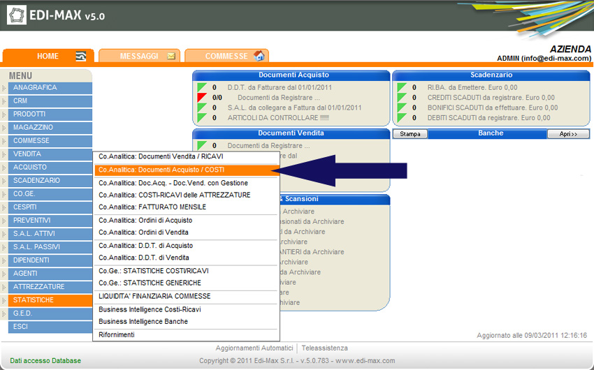 Una delle funzionalità di Edi-Max è quella di visualizzare il totale dettagliato dei costi sostenuti per ogni commessa. Dal menu principale selezionare la voce “Statistiche” e “Co. Analitica: Documenti Acquisto/COSTI”.
