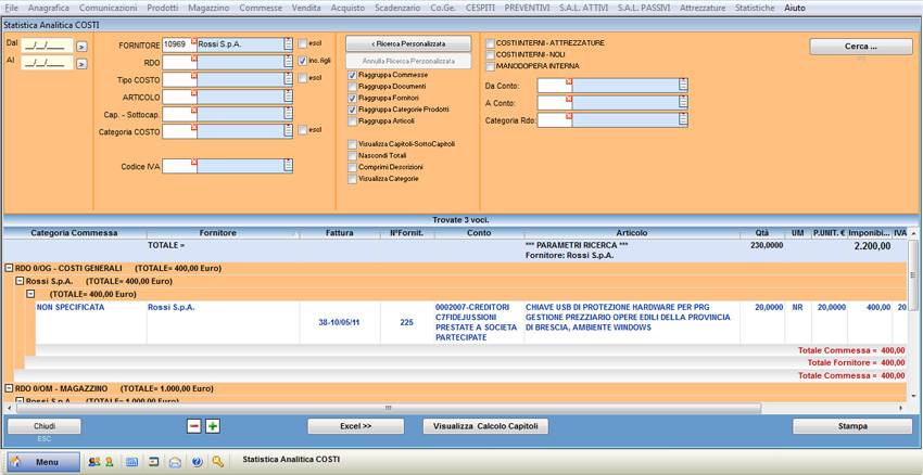 Selezionando l’opportuno checkbox, è possibile raggruppare le commesse, i documenti, i fornitori, le categorie dei prodotti, gli articoli, visualizzare capitoli e sottocapitoli, nascondere i totali, comprimere la descrizione e visualizzare la categoria.