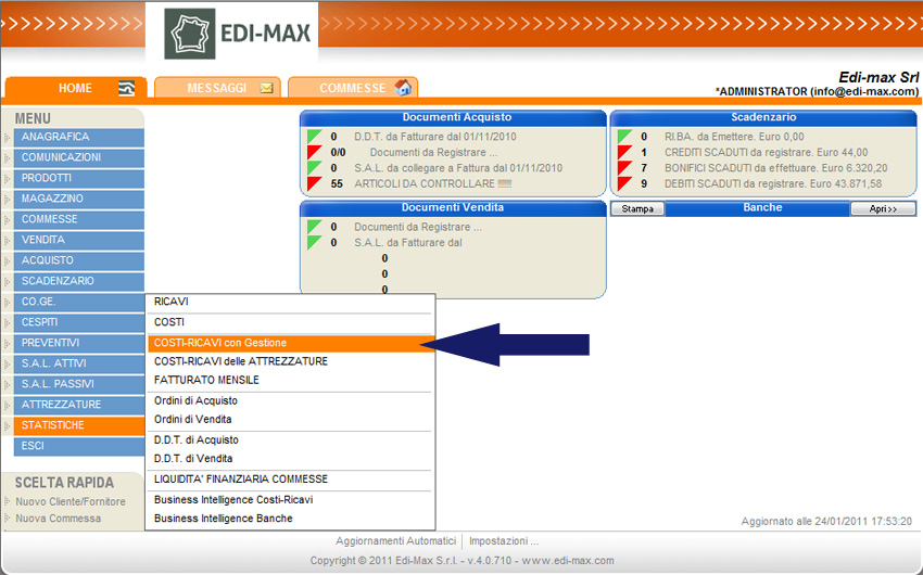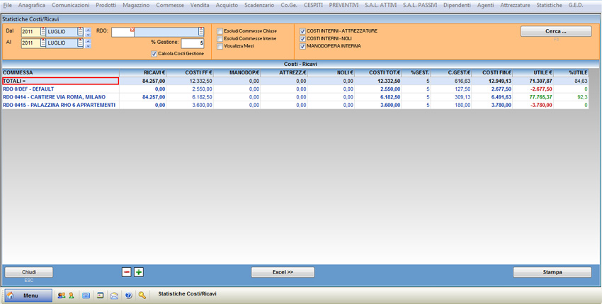 Edi-Max consente visualizzare i ricavi e i costi per ogni singola commessa comprensivi dei costi di gestione (dati da una percentuale sul totale). Dal menu principale selezionare la voce “Statistiche” e “Costi – Ricavi con gestione”.