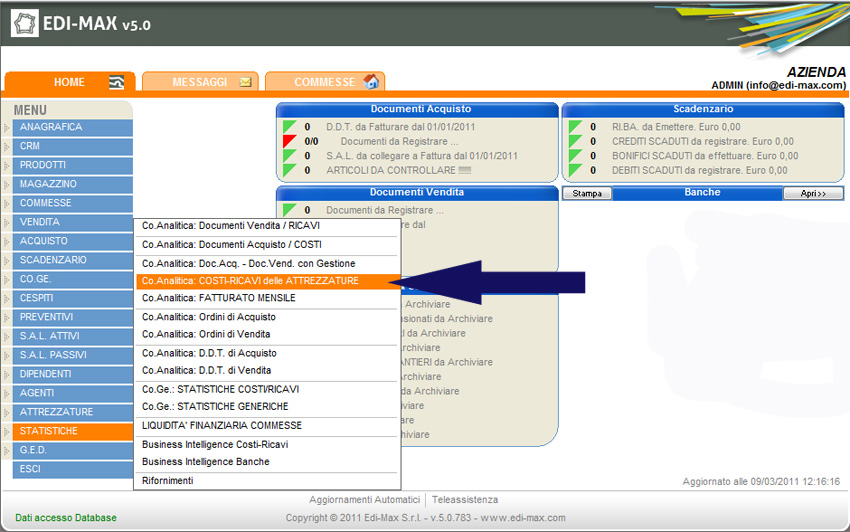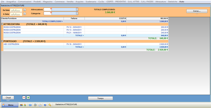 Edi-Max consente visualizzare le statistiche relative alle attrezzature. Dal menu principale selezionare la voce “Statistiche” e “Co. Analitica: COSTI- RICAVI delle ATTREZZATURE”.