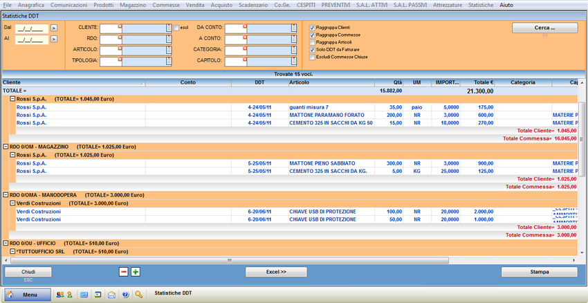 Selezionando il checkbox opportuno, è possibileraggruppare i clienti, le commesse, gli articoli, visualizzare solamente i DDT da fatturare ed escludere le commesse chiuse.