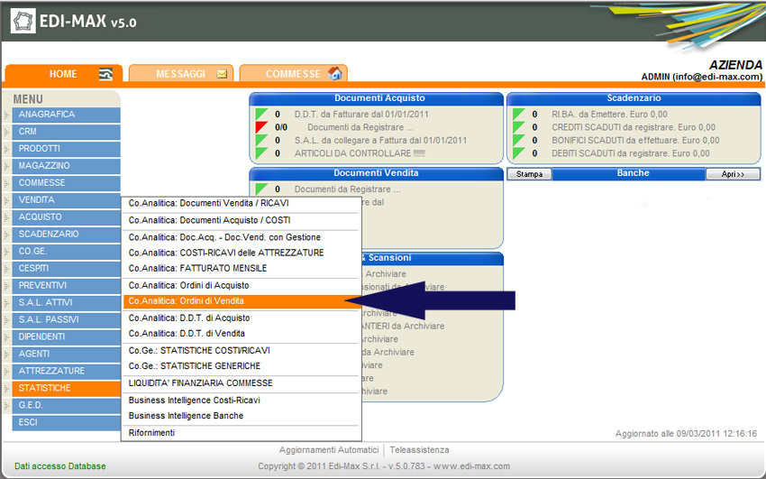 Edi-Max consente visualizzare le statistiche relative agli ordini di vendita. Dal menu principale selezionare la voce “Statistiche” e “Co. Analitica: Ordini di Vendita”.