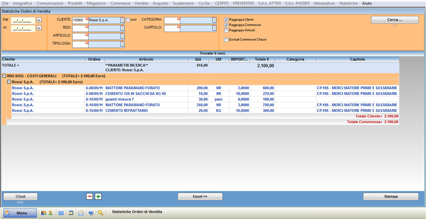 Premere il pulsante “Cerca” o il taso F5 al fine di visualizzare le statistiche desiderate. Ogni riga rappresenta un ordine di vendita, del quale viene specificato il cliente, il numero e la data dell’ordine, la quantità, l’unità di misura, l’importo, il totale, la categoria e il capitolo.