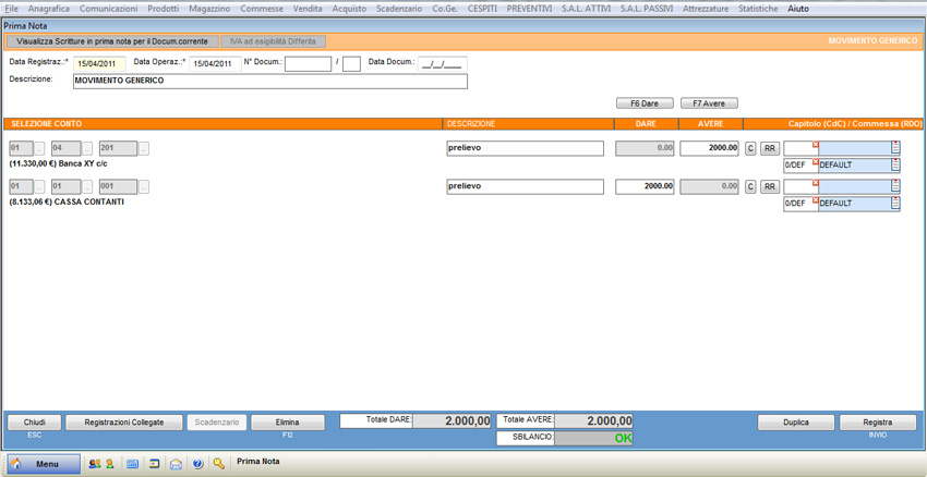 NB: se i moduli "Contabilità analitica" e "Scadenzario" sono abilitati, queste scritture vengono effettuate in automatico.
