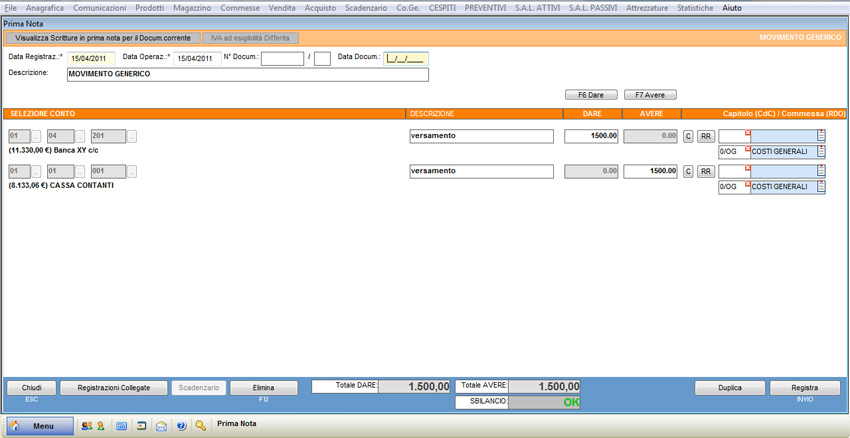Si supponga di dover registrare il versamento su un conto corrente bancario per un importo di 1.500 €.